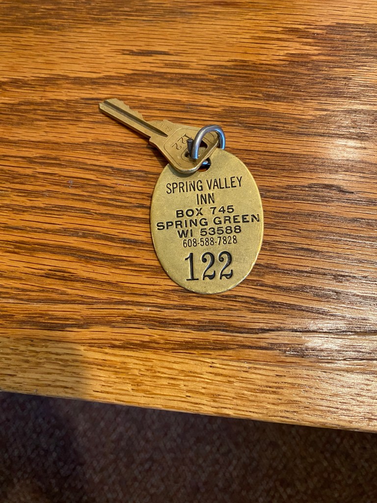 Our hotel for the night was the Spring Valley Inn, a charming place with a Frank Lloyd Wright feel.  The Inn was originally built as a visitor’s center for Taliesin by the architectural firm that Wright founded.  We even had an old-fashioned room key instead of those plastic cards that most places use now.