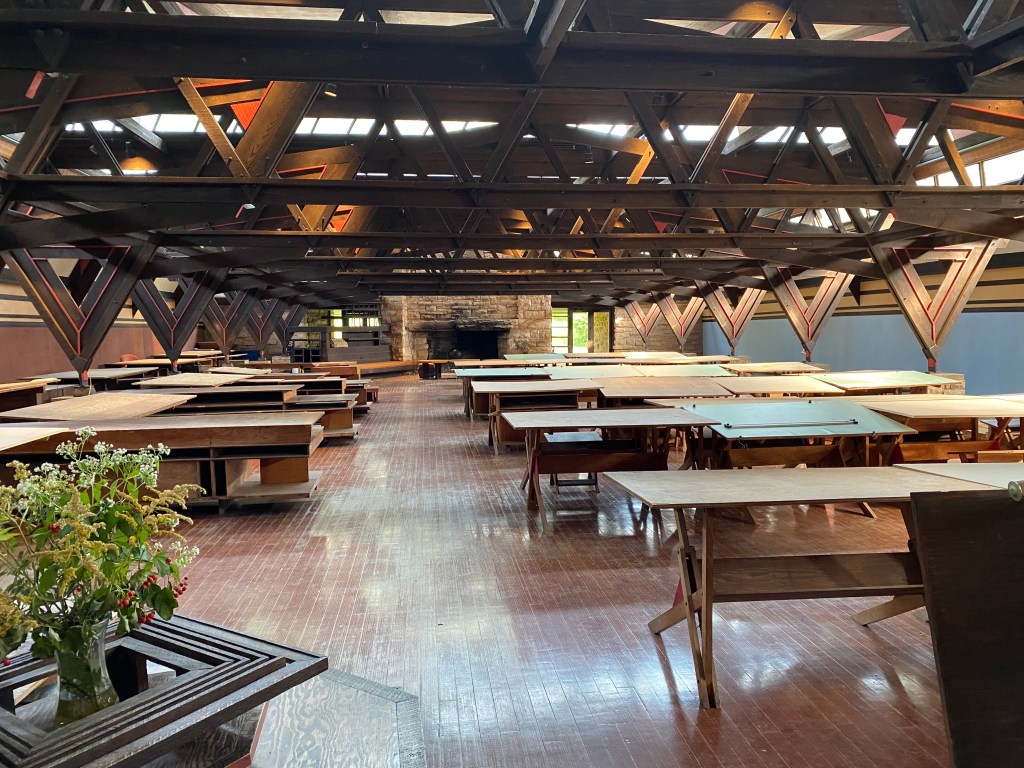 Taliesin no longer offers an architecture school, but the space and drafting tables are still in place.  The floor is unusual in that it’s plywood turned on end, giving it a stripe effect.  Plywood was just coming into use in the late 1920s, and Wright found several applications for it.